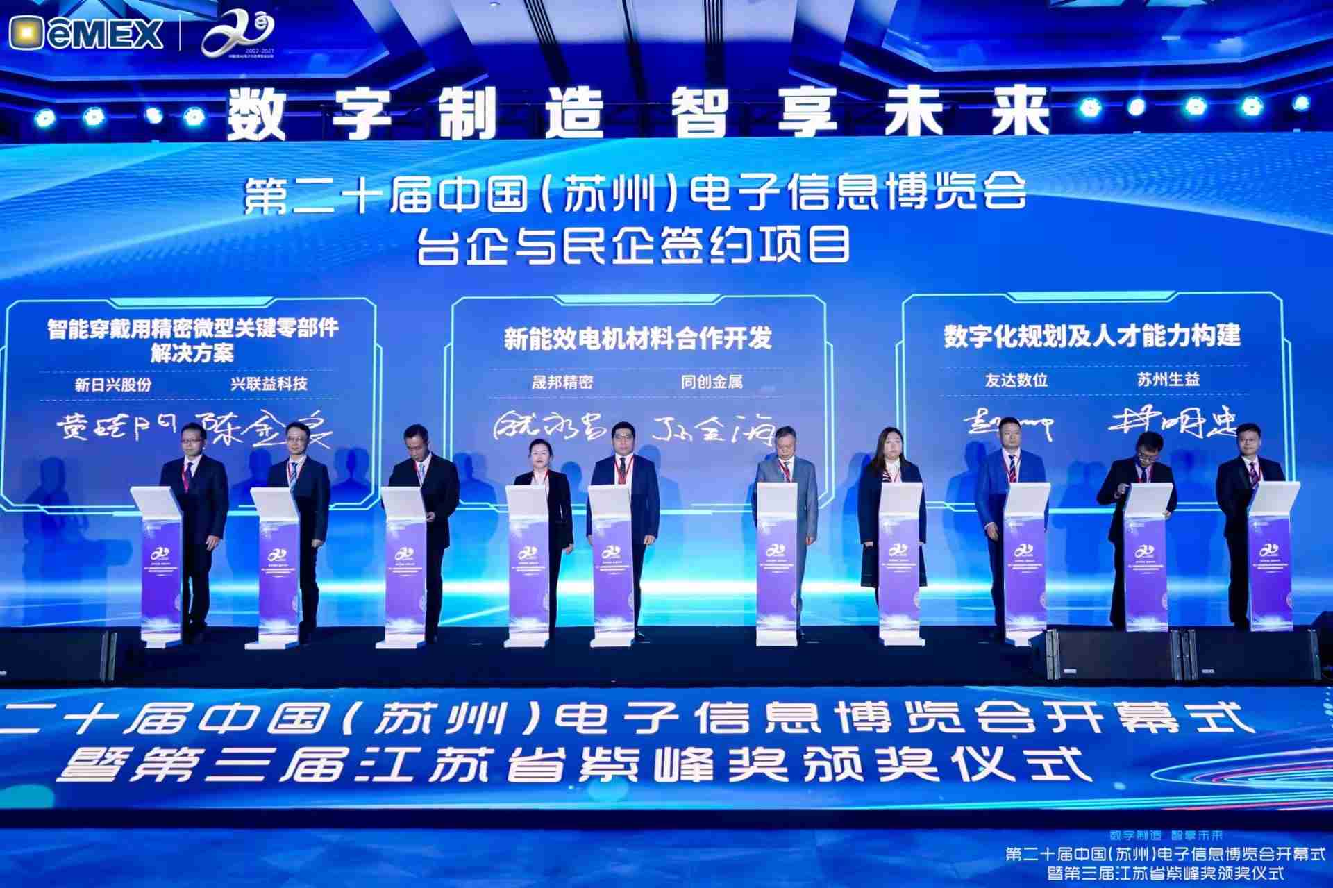 电博会开幕式当天也是第三届江苏省紫峰奖颁奖仪式,,,,省台办、、工信厅、、、商务厅、、苏州市相关领导均出席并颁奖。。。该奖项为表彰对江苏高质量发展做出积极贡献的在苏企业,,由江苏省政府专门设立。。918.COM光电 (苏州) 总经理郭振明代表上台领奖,,,,这也是918.COM苏州连续三次蝉联紫峰奖 出口贸易领军企业奖。。。918.COM数位总经理赵丽娜女士,,,也参与本次开幕式,,,,上台为本地化赋能签署战略合作协议,,,,将优质服务资源集合、、、下沉到更多细分行业,,为更多地区的制造企业提供数字化转型服务。。