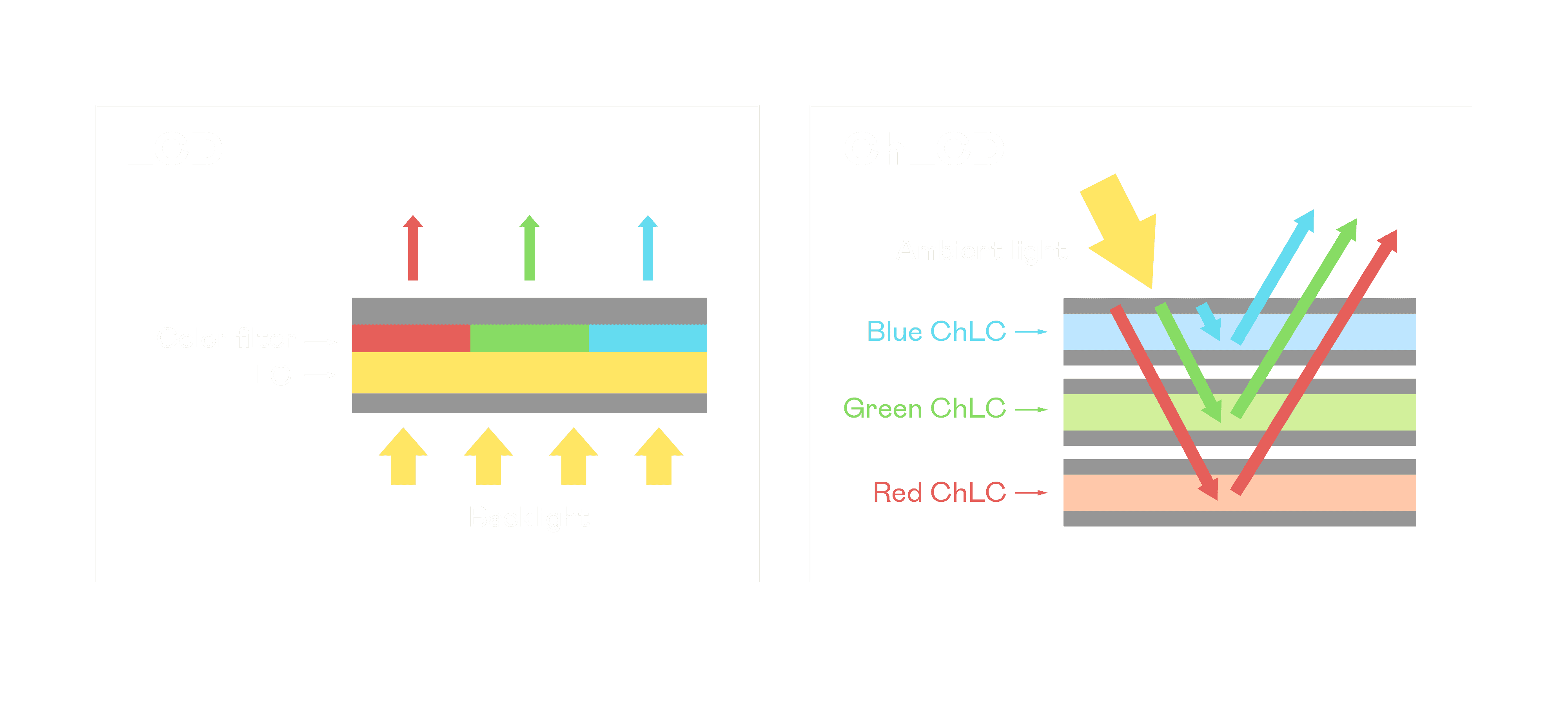 ChLCD 胆固醇液晶就如同纸张一样,,,,透过反射环境光来显示影像,,因此长时间观看不易造成人眼视觉疲劳,,,可达到护眼效果。。。。当处于户外阳光下使用,,LCD 影像容易失真而不易观看,,但胆固醇液晶仍可维持较佳的影像品质。。。