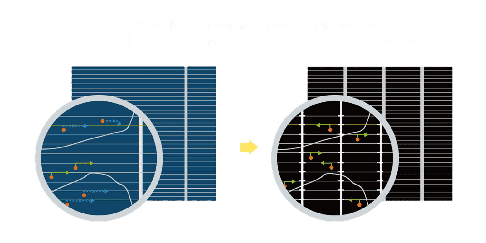 • 电池使用多条铜导线 (Copper wire) 于电池片上形成较短的电流路径,,,,提高电流收集效率,,,,采用圆形设计的铜导线较传统扁平式的铜焊带 (Ribbon),,,可增加入射至电池的光线量。。。