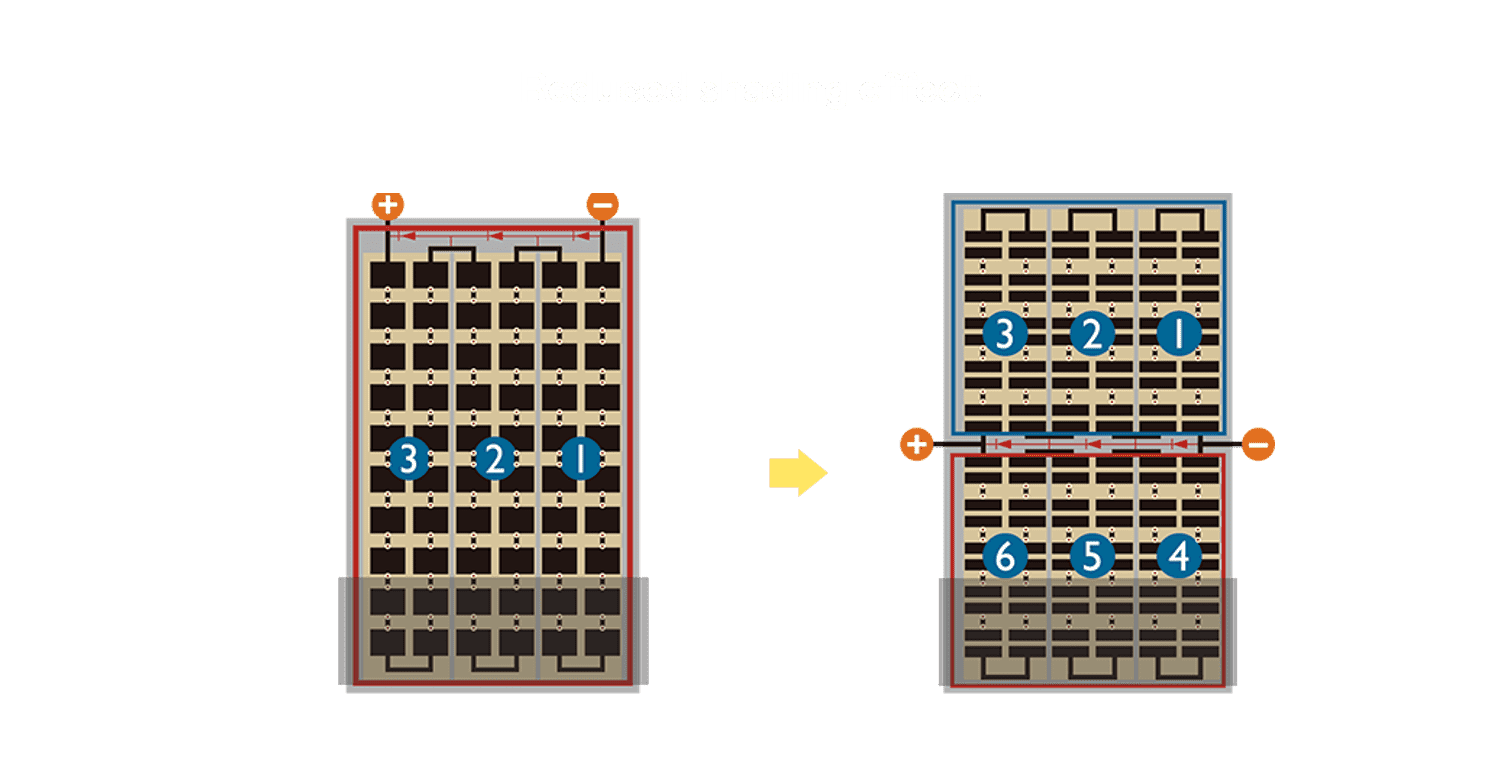 • 结合半切电池,,,降低遮阴影响、、、提升模组抗隐裂能力、、、、并减少电阻损耗,,,进一步提升模组发电效能。。。。