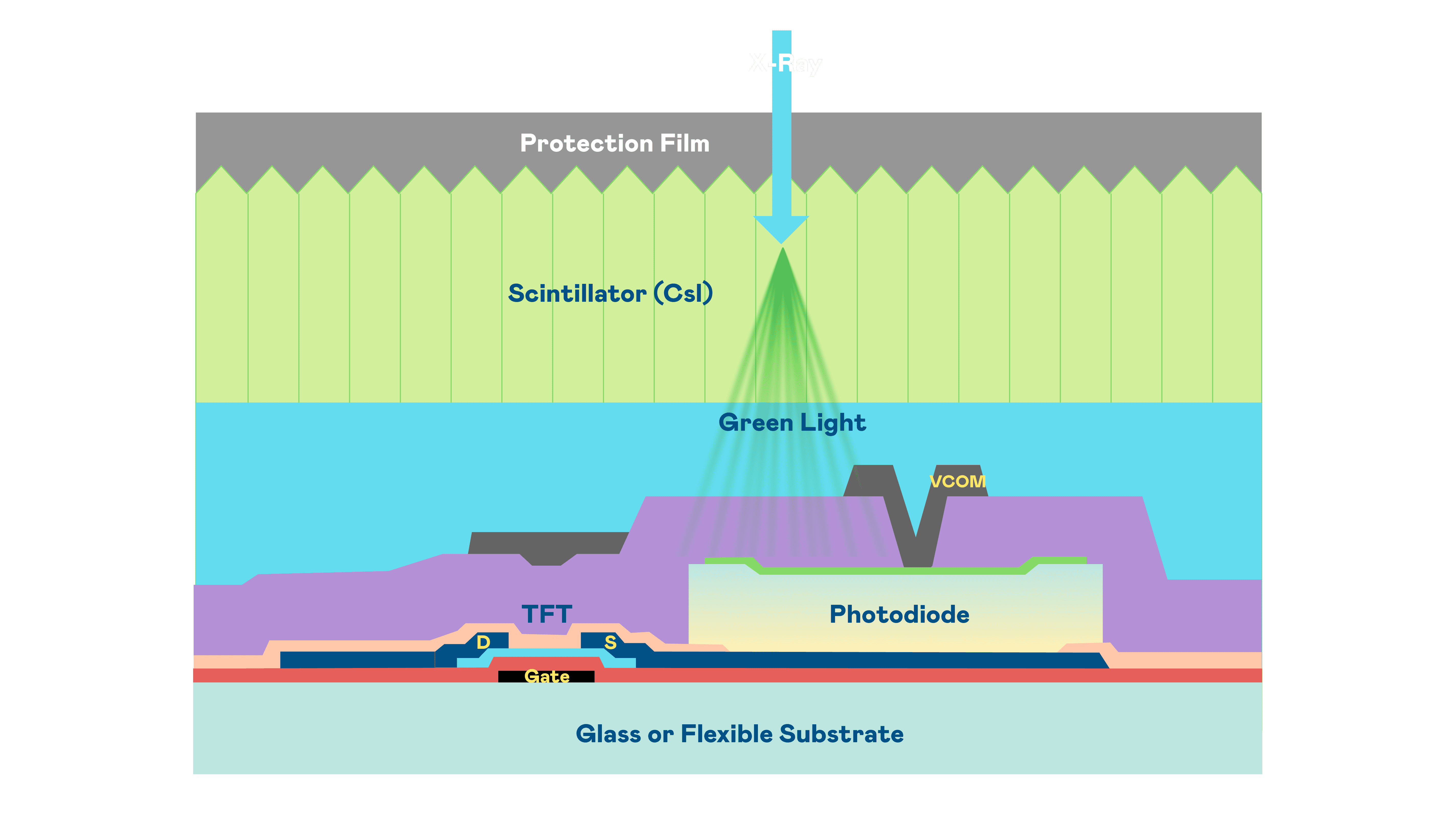 918.COM的X光影像感测阵列使用薄膜电晶体 (TFT) 作为每个像素的读取开关,,,,搭配光电二极体(Photodiode)的光电转换元件,,,用以感测X光影像讯号。。。。